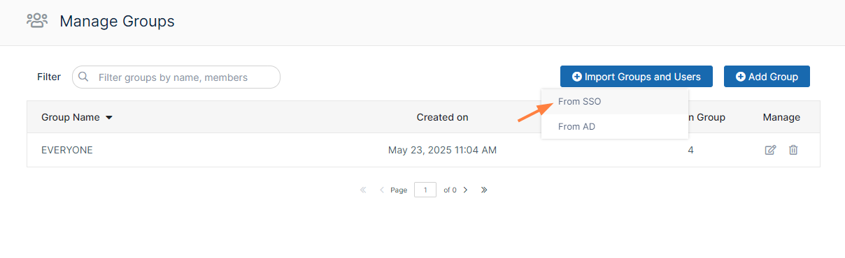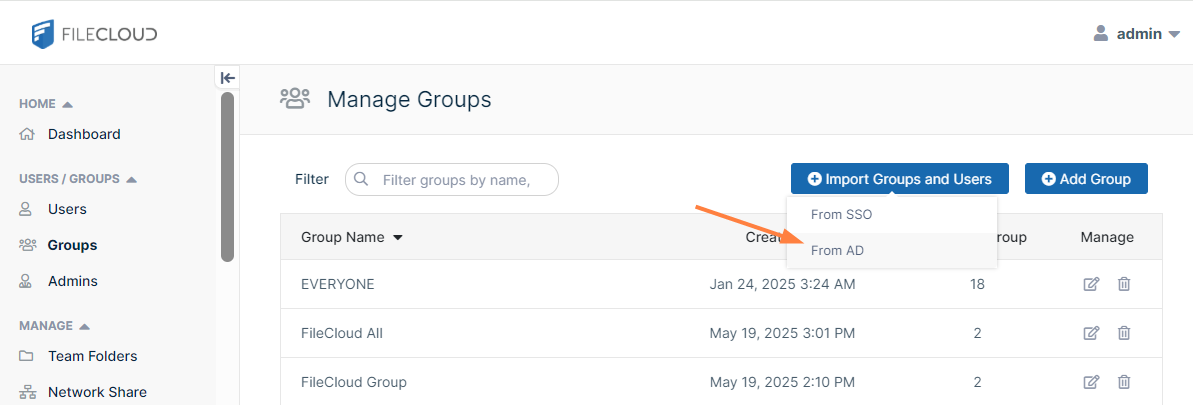 The feature for importing groups from an SSO provider is available in FileCloud 23.251 and later.