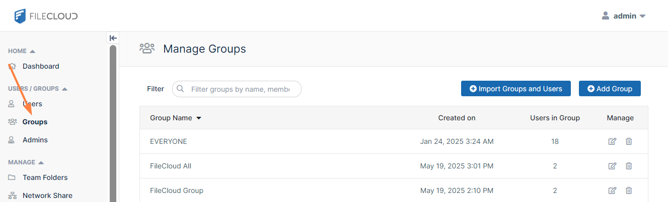 Administrators can create groups of users in FileCloud Server. Creating groups allows setting network share access and sharing of files and folders for multiple users.