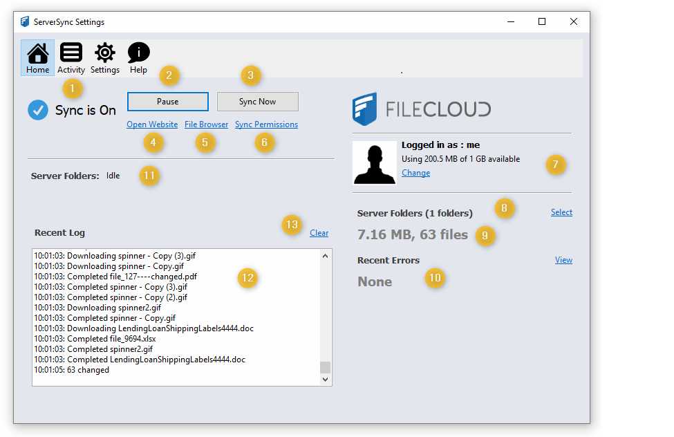 | 10 | Recent Errors View | Allows you to view and clear recent syncing errors. Useful for troubleshooting ServerSync problems. Changes the selected tab from the Home screen to the Activity screen.