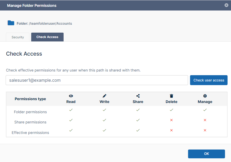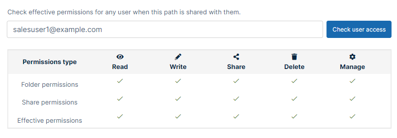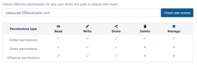 - Whichever is more restrictive, share permissions or folder-level permissions, apply.