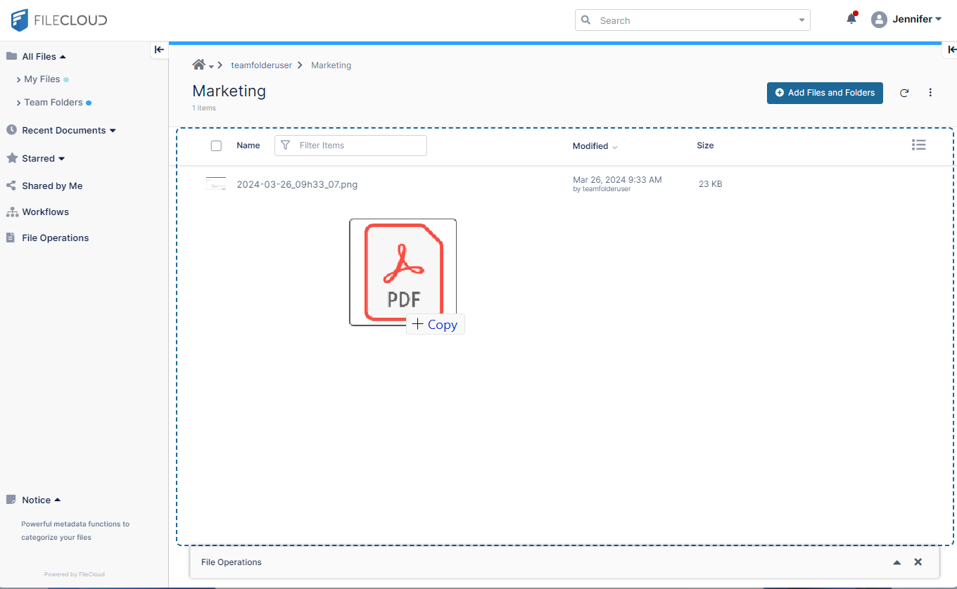 We trigger the Copy File workflow by adding the file Latest Counts to the Team Folders/Marketing folder.