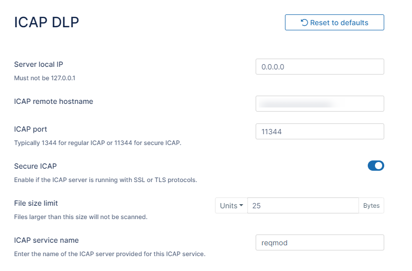 ICAP Port Leave the default value of 1344 or use 11344 for secure ICAP. In rare cases, this might need to be changed to whatever port the ICAP DLP server is listening on. Secure ICAP Enable if the ICAP server is running with SSL or TLS protocols. File Size Limit To exclude very large files from scanning, specify the file size limit in bytes. Default value is 25MB. ICAP Service Name Consult the ICAP DLP server product documentation for this value. It must be set correctly; otherwise, integration won't work. Click Save.