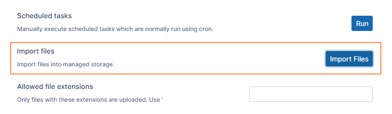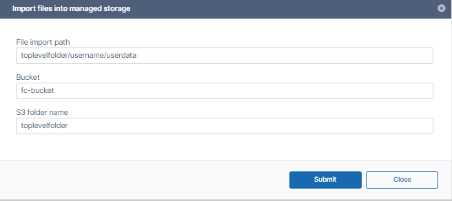 On theImport files into managed storage dialog box, fille in the fields as follows: File import path - The originating folder of the content to be imported. Bucket - the name of the bucket that contains the files you want to import. S3 folder name - the name of the top level folder in the bucket that contains the files you want to import.