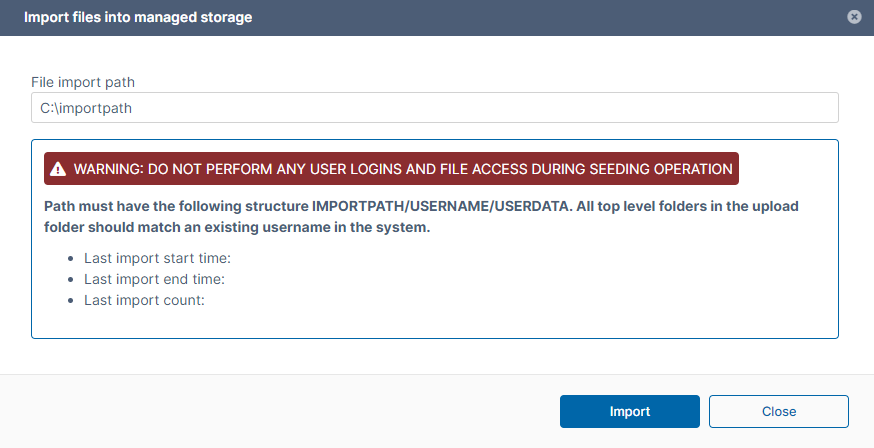 On theImport files into managed storage dialog box, in File Import Path, type the location to the files you want to import in the format C:\importpath or \import\data.