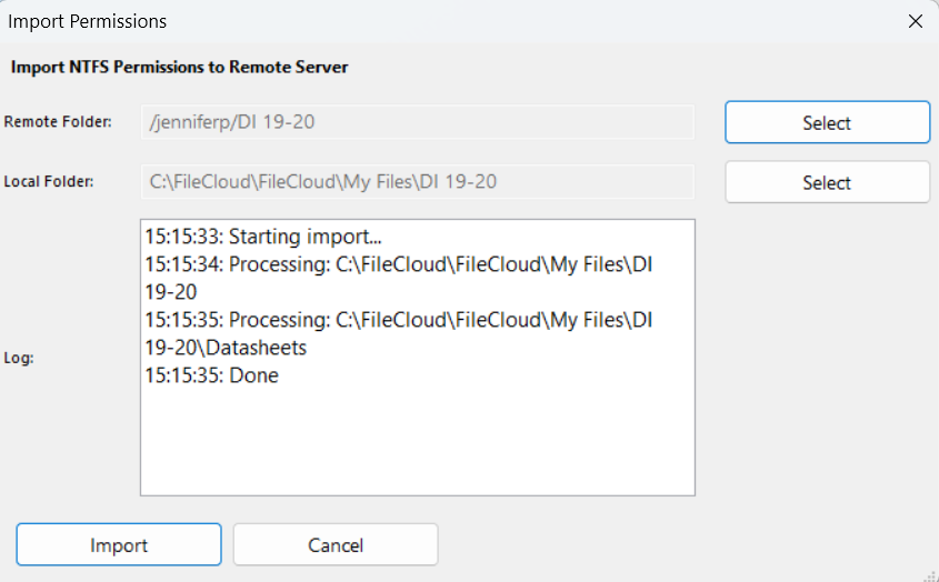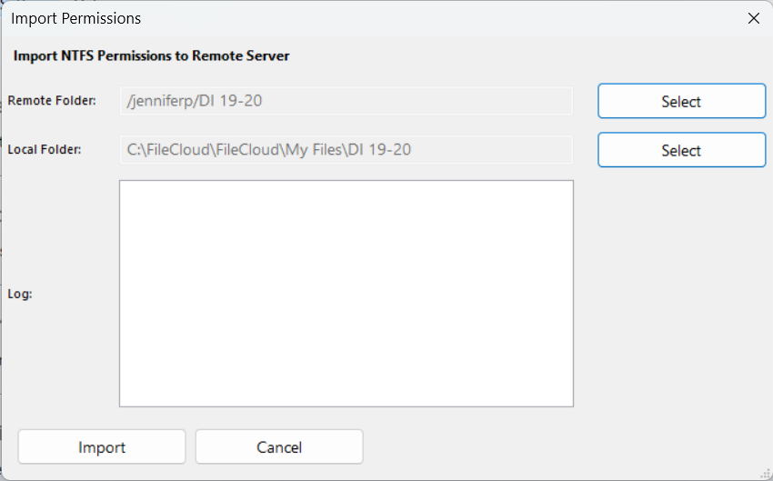 Note: You cannot import permissions from shared folders. - In the Import Permissions window, click Select for Remote Folder.