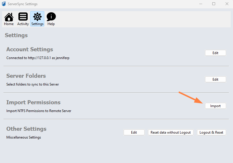 - On the Settings screen, in the Import Permissions section, click Import.