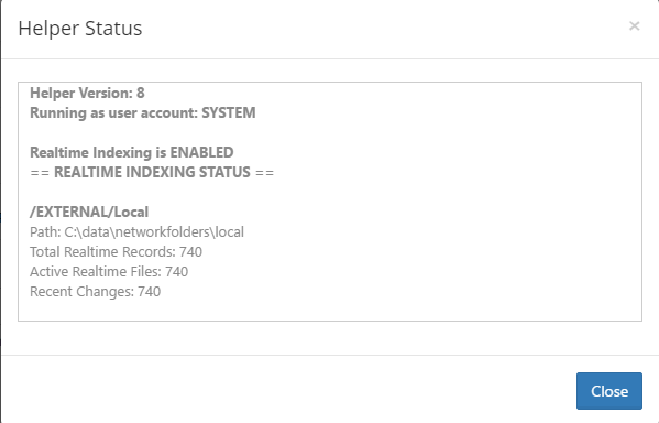 - Verify that the Helper is configured correctly by opening Settings > Misc > Support Services in the admin portal. Click the Helper Status button and ensure the status shows that realtime indexing is enabled.
