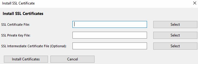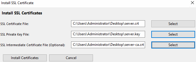 - Optionally, to install an intermediate certificate, across from SSL Intermediate Certificate File, click Select.
