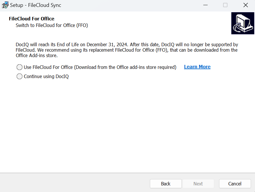 If you are already a Sync user using DocIQ, and this is an upgrade, the next screen gives you the option of using DocIQ or FileCloud for Office. For more information, see Using FileCloud for Office with Sync. If you are a new Sync user, the following screen does not appear.
