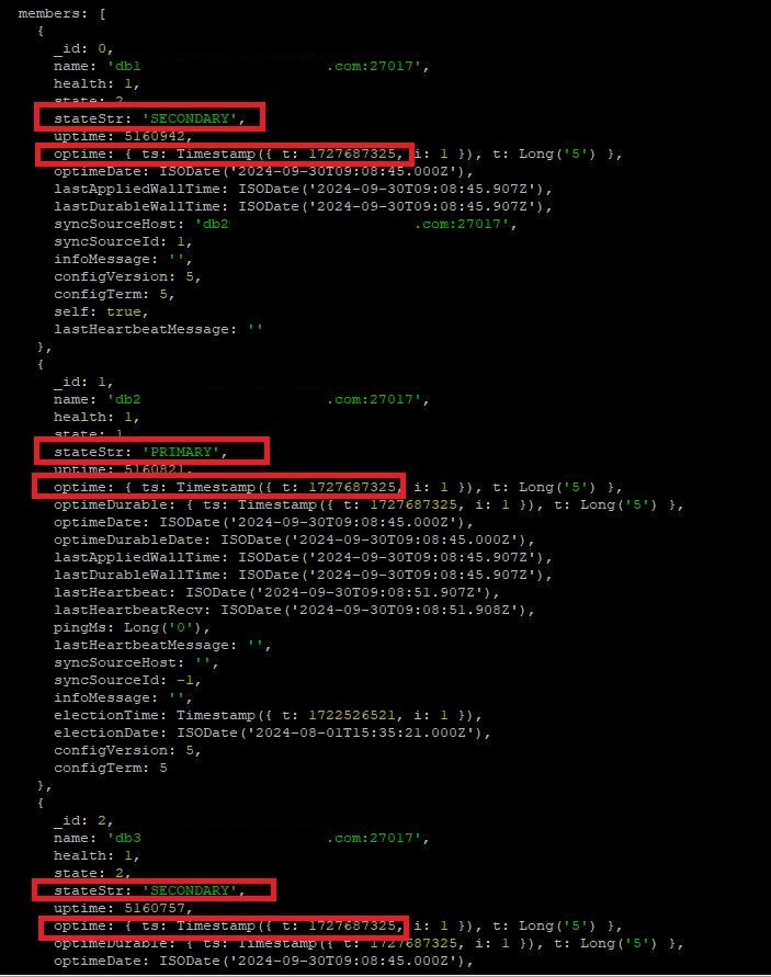 Run rs.status() inside the Mongo Shell to see the replica set status. One of the nodes should show as Primary, and the other two nodes should show as Secondary. The same optime on all the servers indicates that the servers are in sync.