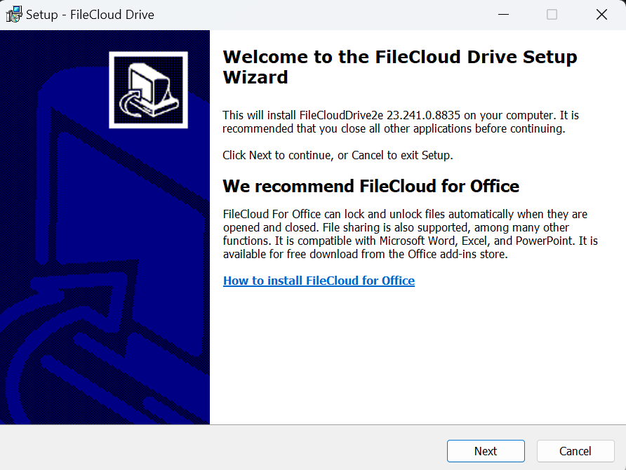 http://www.filecloud.com/additional-downloads/#drive - To run the installation wizard, click the FileCloudDrive2eSetup.exe execution file you just downloaded.