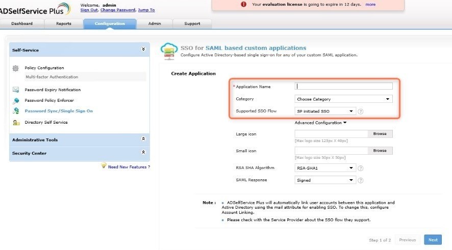 To go to the SSO for SAML based custom applications/Configure Application page, click Next.