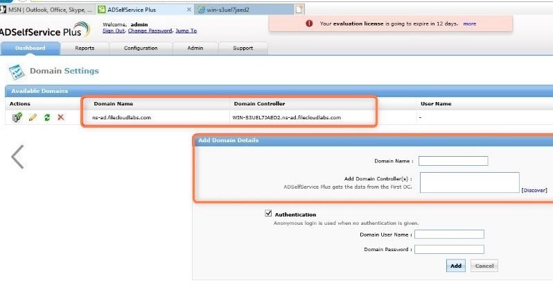 If AD is already installed, Domain Name and Domain Controller are automatically detected and entered for you. If they are not automatically entered, in Add Domain Details, enter them, and click Add.