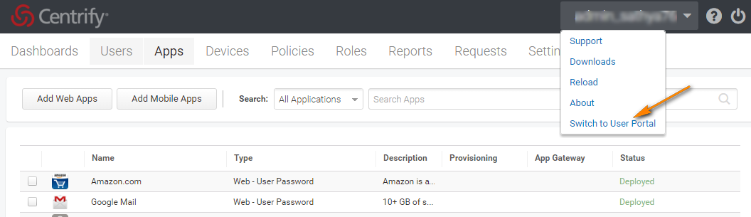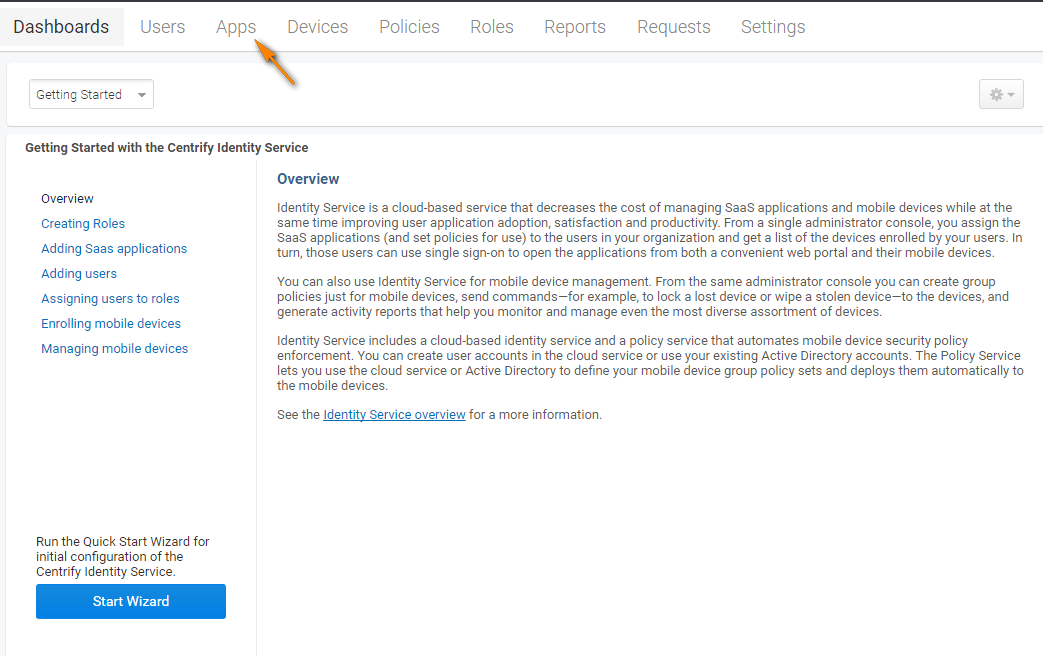- After successful login to Centrify, go to the admin section and to the dashboard.
