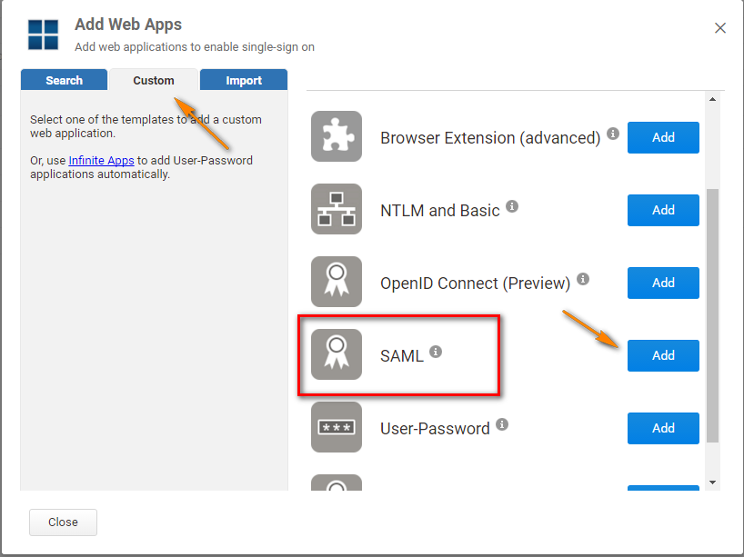 - On the Add Web Apps screen, click the Custom tab and choose SAML, then click Add.