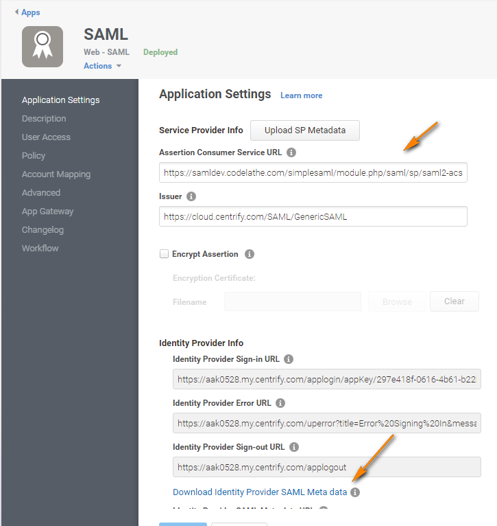 - In the SAML Web App Screen, click Application Settings in the navigation panel.