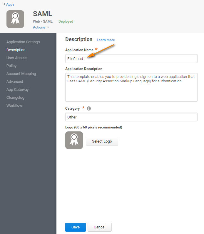 - In the SAML Web App Screen, click Description in the navigation panel.