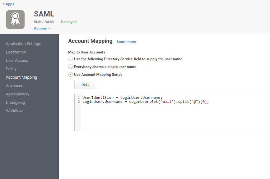 - In the SAML Web App Screen, click Account Mapping in the navigation panel.