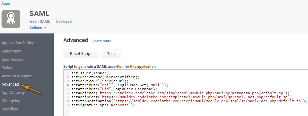 - In the SAML Web App Screen, click Advanced in the navigation panel.