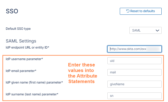 Under Attribute Statements, the attribute names must match the names set in the FileCloud admin portal in Settings > SSO for Idp Username Parameter, Idp Email Parameter, Idp Given Name Parameter, and IDP Surname Parameter.