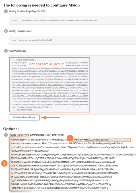 (2) Confirm that the text in the IDP Metadata box is the same as the text in Idp Metadata in FileCloud admin UI interface under Settings > SSO.Click Download certificate, then copy the certificate file and rename it to saml.crt.
