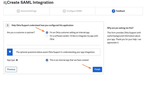 - Click the Feedback tab of the Create SAML Integration screen, then select I'm an Okta customer adding an internal app, and click Finish.