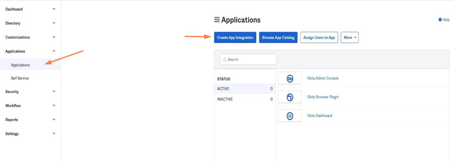 - After successful login to Okta, go Applications > Applications, and click Create App Integration.