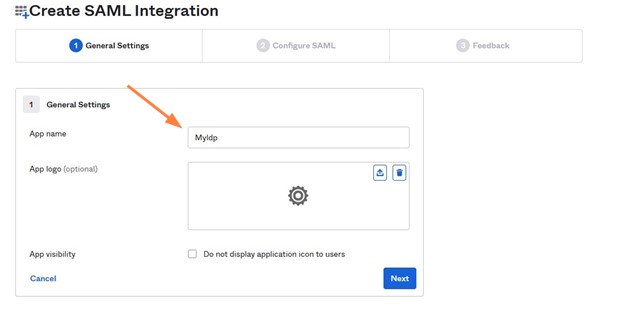 - In the General Settings tab of the Create SAML Integration screen, enter a name for App name, and click Next.