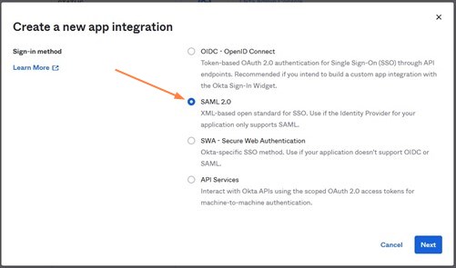 - In the Create a new app integration screen, select SAML 2.0, and click Next.