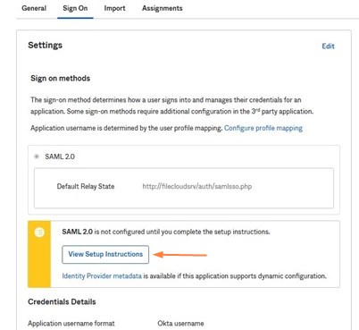 - Go to the Sign On tab, and click View Setup Instructions to view FileCloud SSO configuration details .