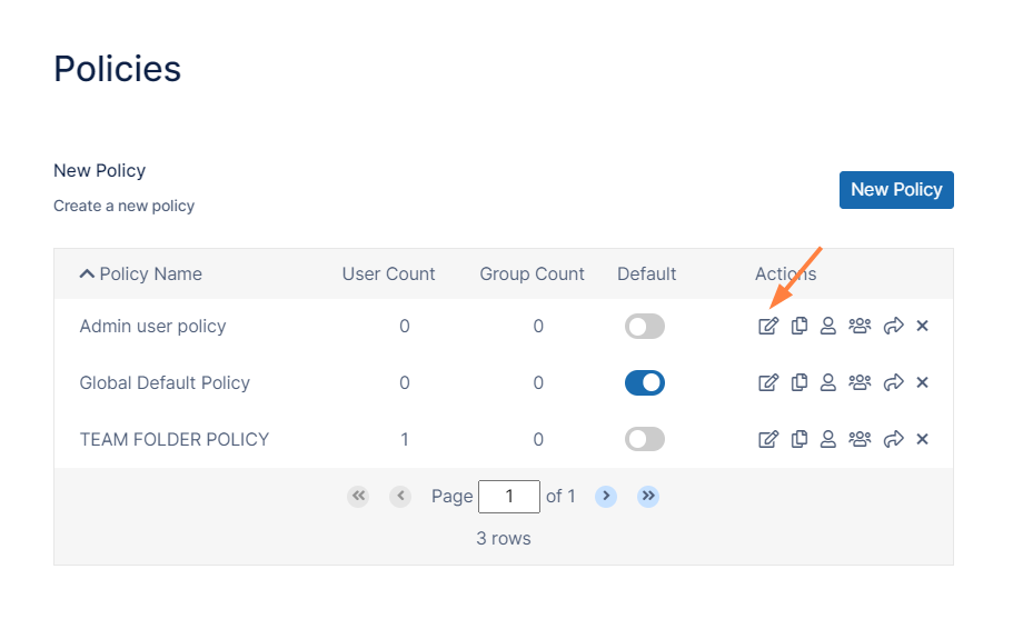 On the Manage Users screen, click the user who you want to add to the new policy, and then click the edit button ().