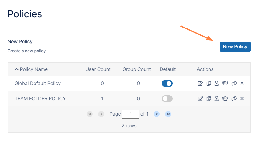 In the FileCloud admin portal's left navigation bar, scroll down and clickSettings.Then, on theSettingsnavigation page, clickPolicies . The Policies page opens.
