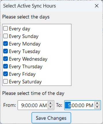 (lightbulb)  You can only set one time when ServerSync will run for every day you select. The default time is from 8:00:00 AM To 8:00:00 PM.