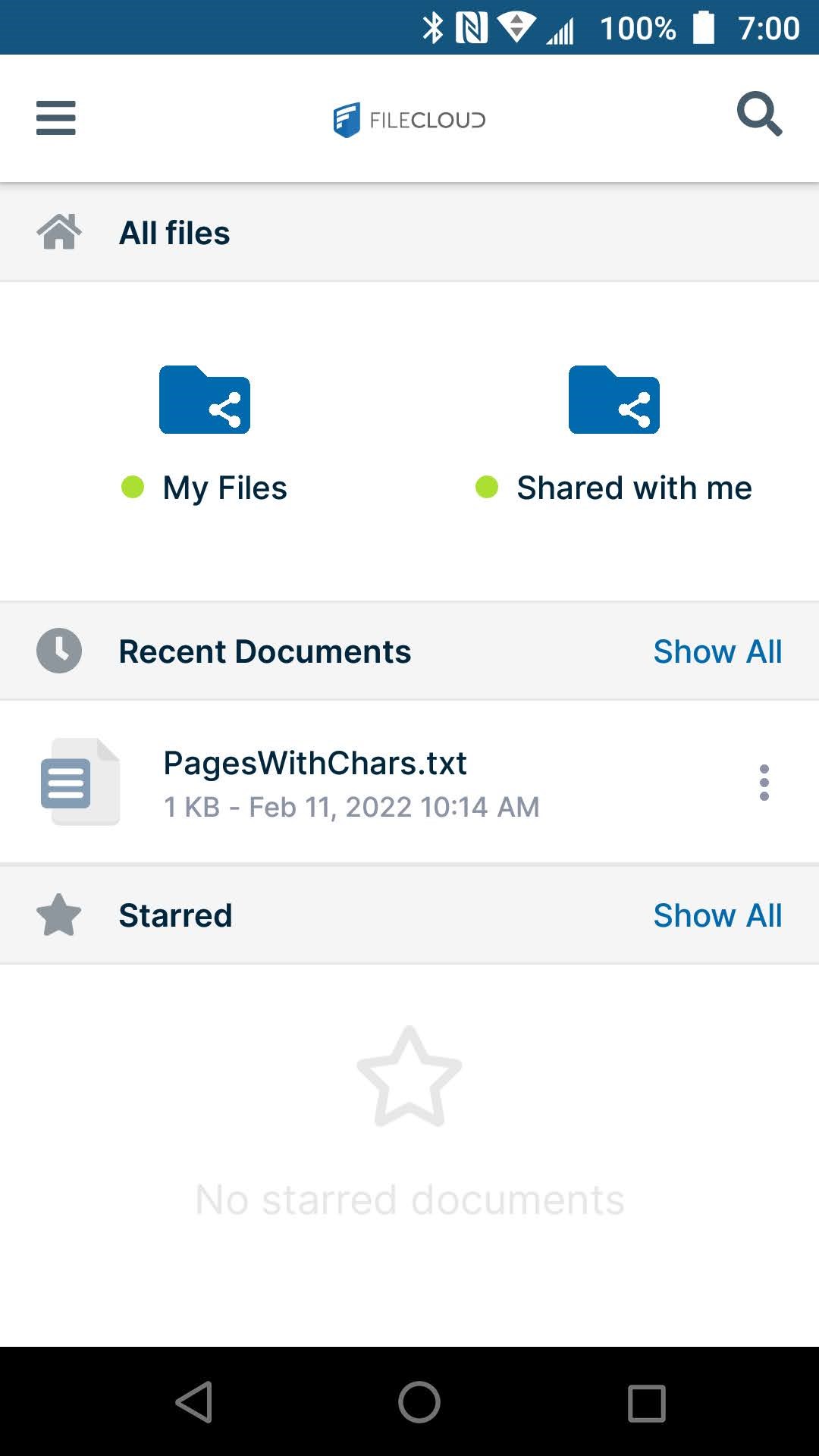 Once you successfully log in, you will not have to enter a security code again unless your administrator deletes your Android from FileCloud's list of devices.