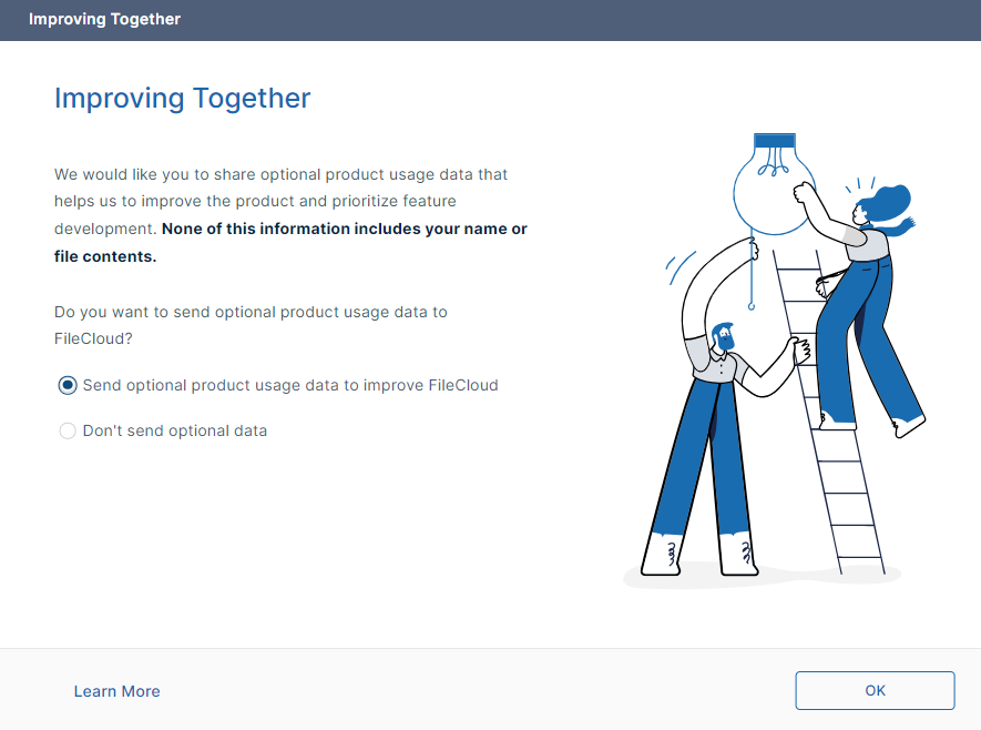 To allow sending of optional product usage data to FileCloud, leave Send optional product usage data to improve FileCloud selected, and click OK. To prevent sending of optional product usage data to FileCloud, select Don't send optional data, and click OK.