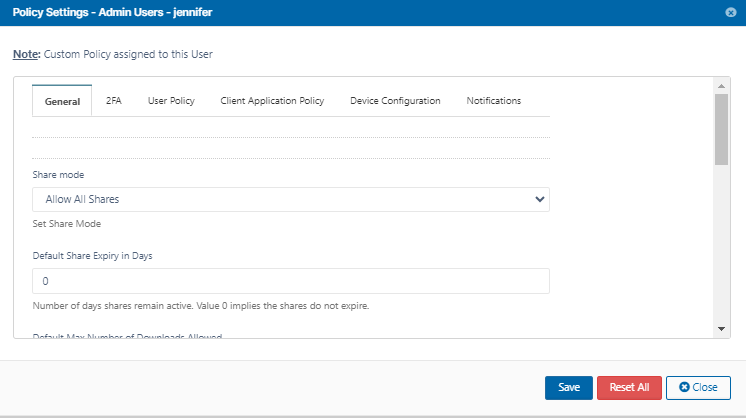 Across from a user, click the Manage User Policy (gears) icon. The Policy Settings dialog box opens.