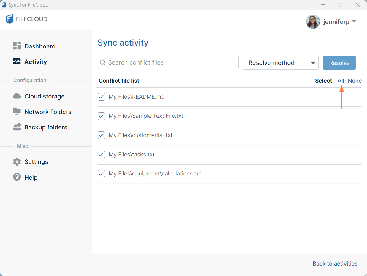 At the bottom of the window, click the Resolve Conflicts link. The window now displays the file conflicts with checkboxes beside them and a Resolve method drop-down list.