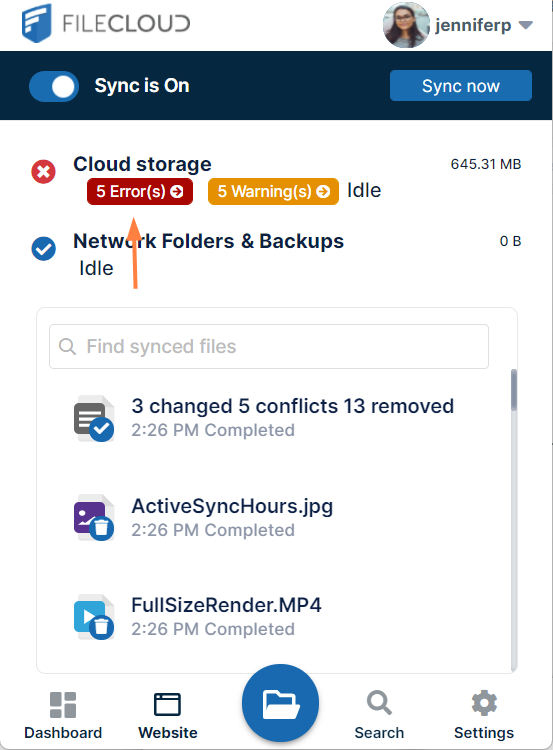 In your system tray, right-click the Sync icon and chooseOpen. The mini-dashboard opens. If a previous Sync resulted in conflicts or other errors, it displays an error notification.