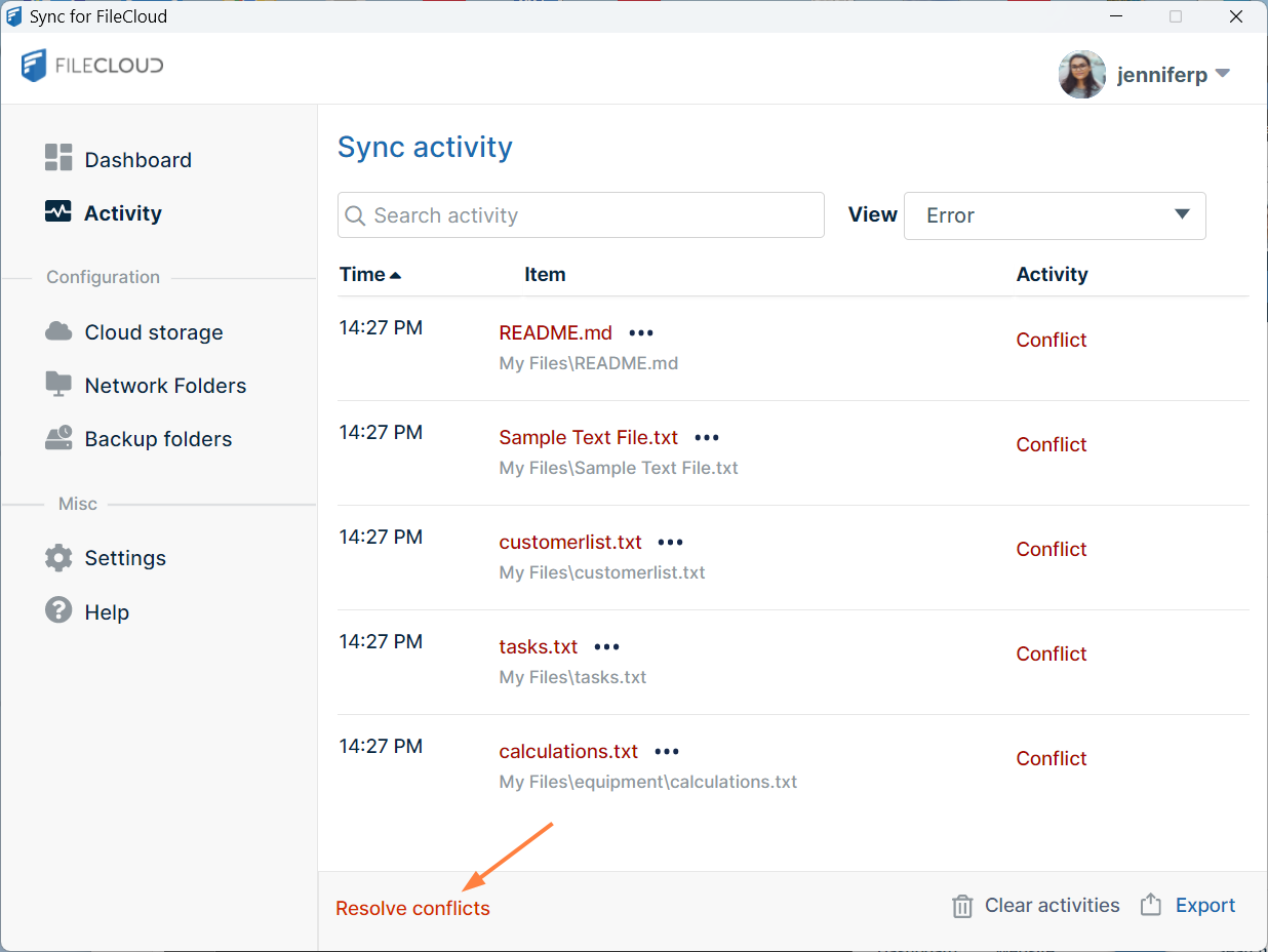 Click the error notification. The dashboard opens to the Activity window with Error selected in the View drop-down list. Errors, including conflict errors, are listed below it.