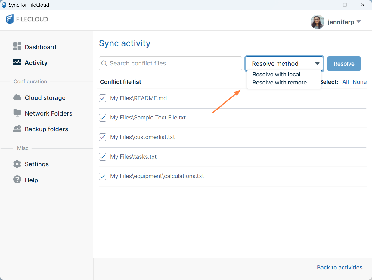 In the Resolve method drop-down list: Choose Resolve with Local to discard the server file and keep your modified local file for each checked conflict. or Choose Resolve with Remote to discard the local file and save the file that is currently on the server for each checked conflict.