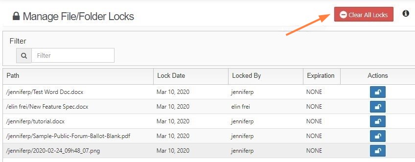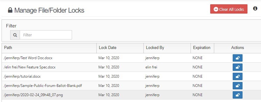On the Manage File/Folder Locks screen, view the list of all files and folders currently locked.