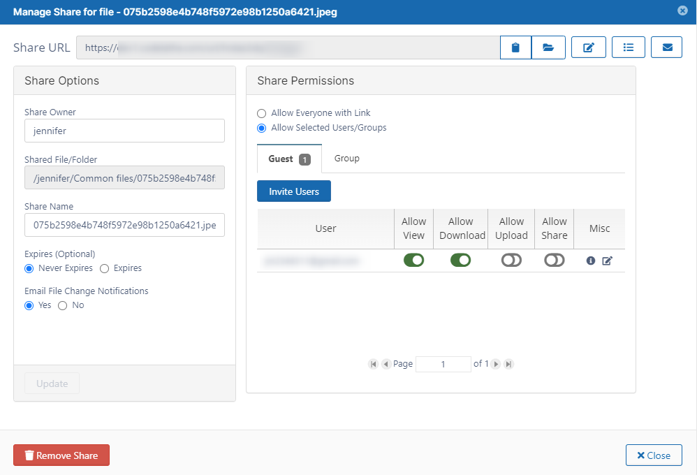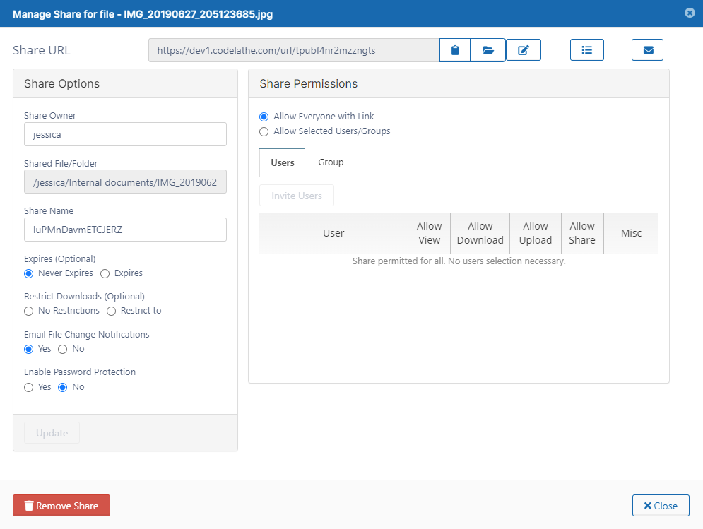 The Administrator is able to view, modify or remove shares done by users of the system.