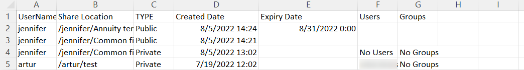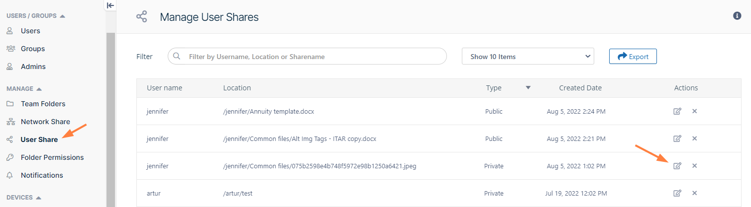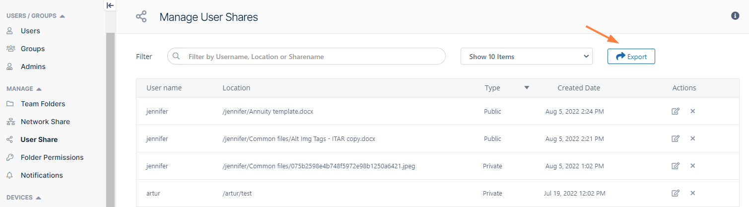 The admin can also export a file listing all shares and their details from the User Shares screen.