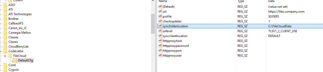 Note: The registry key (HKEY_LOCAL_MACHINE\SOFTWARE\CodeLathe\FileCloud\DefaultCfg) must be created manually, including the default values.