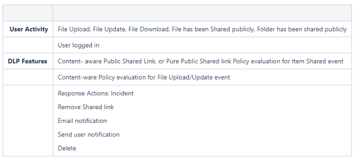 This enables you to use McAfee CASB to apply extensive DLP rules when monitoring user events such as actions on files and folders and logins to the system. If a CASB DLP rule is violated, McAfee takes actions such as notifying a user, deleting a file, or removing a share.