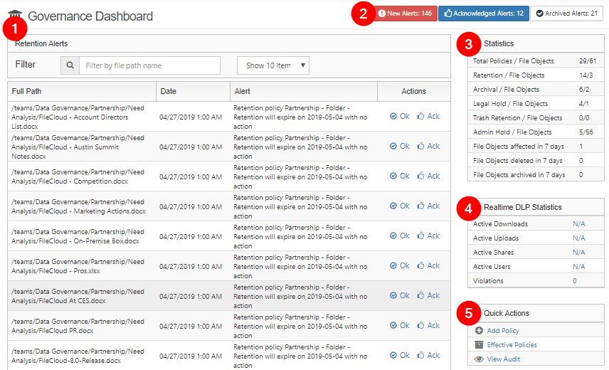 | 5) Quick Actions | Add Policy - Add a retention policy, and apply it to files and folders. Effective Policies - View a list of retention policies and the files and folders they affect. View Audit - View system audit logs. Defaults to displaying retention audit logs. |