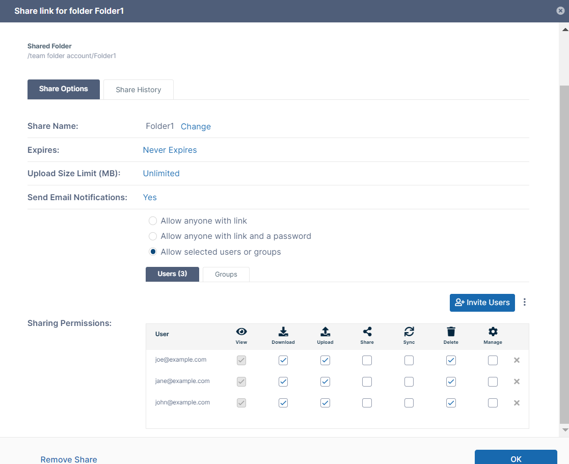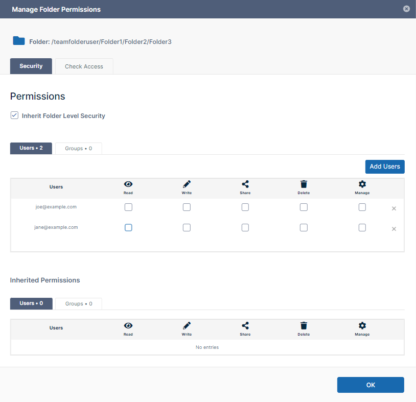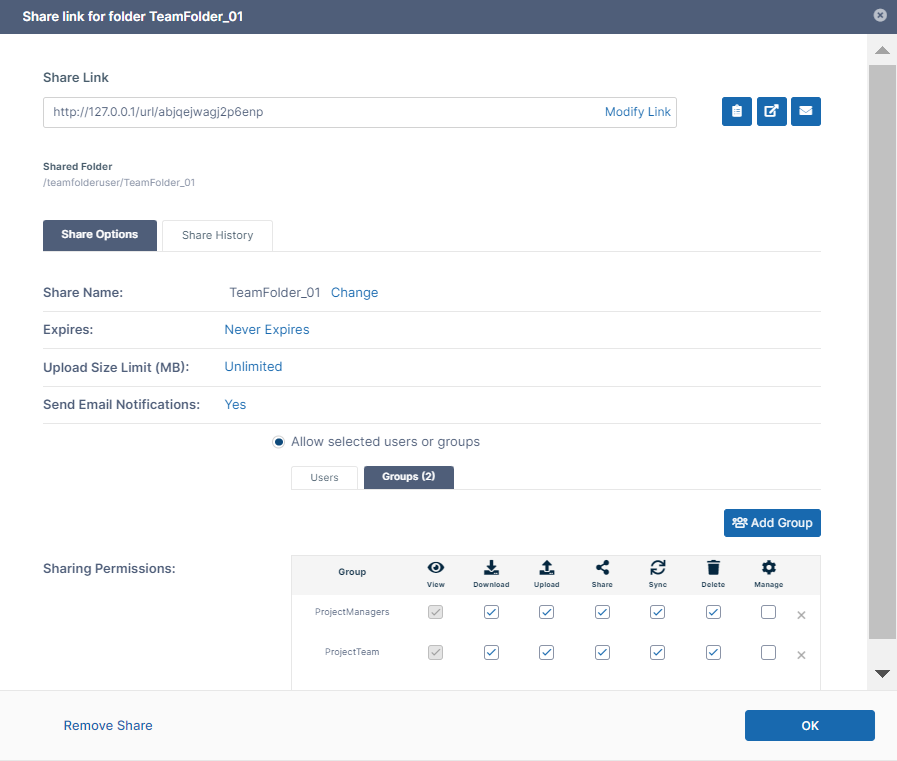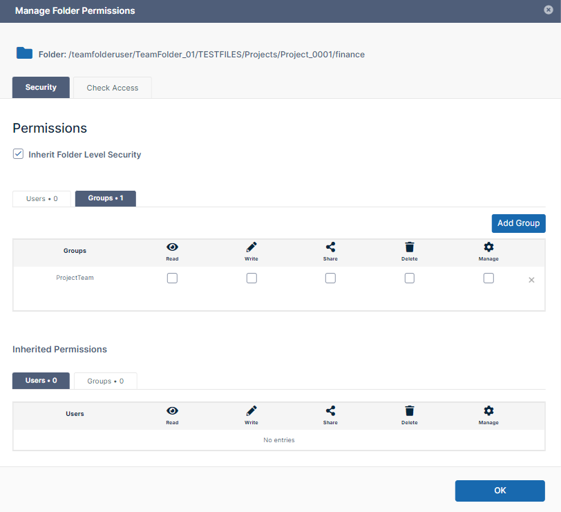 In this example, the folder TeamFolder_01 is only shared with the groups: - ProjectManagers