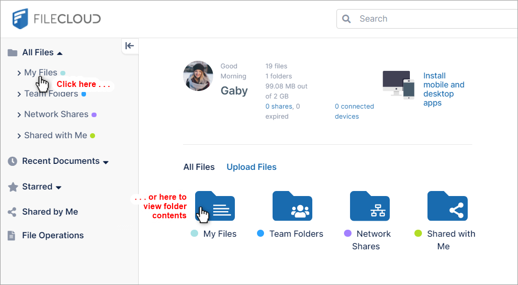 The My Files folder appears for all users with Full user accounts. Team Folders and Network Shares appear if you have been given access to them. Shared with Me appears if another user has shared a file or folder with you.