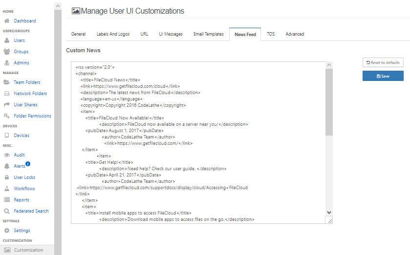 Note: Beginnig with FileCloud Version 20.3, the news feed xml supports the use of CDATA sections.