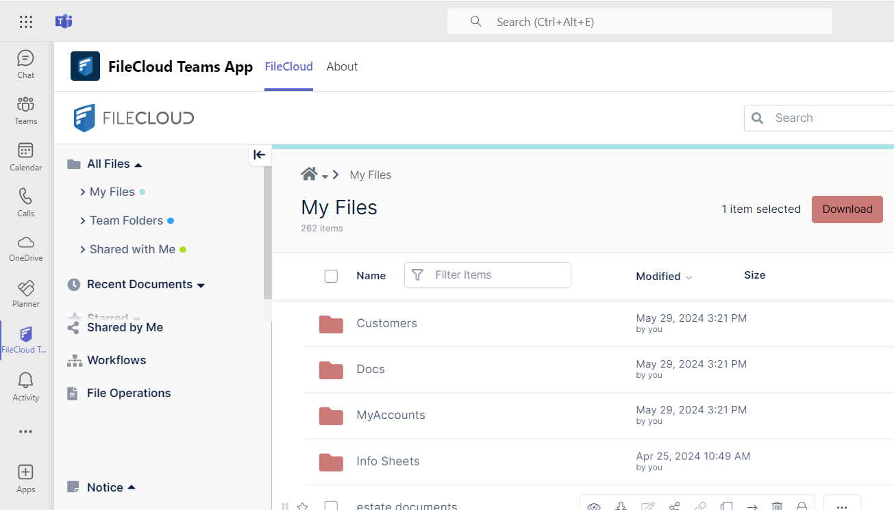 Once FileCloud has been integrated with MS Teams, you can click the FileCloud tab to open the full user portal while working in MS Teams.